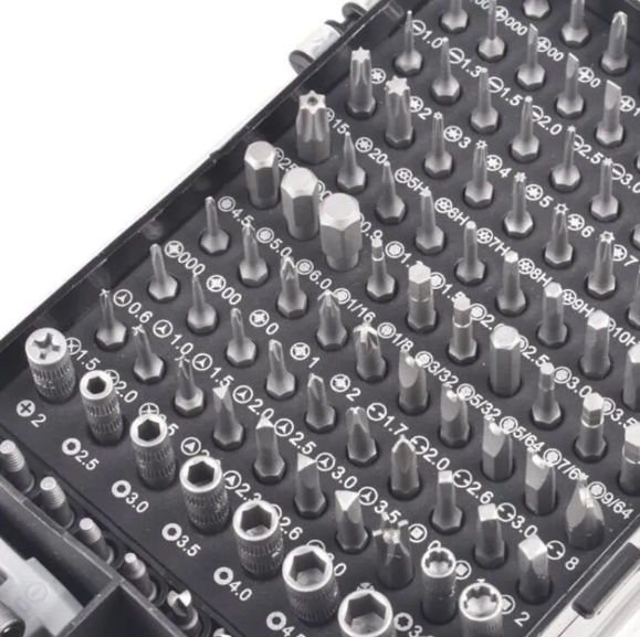The core of the kit is the extensive array of interchangeable screwdriver bits, featuring over 100 magnetic tips in every common and specialty type, including Phillips, Torx, Hex, Pentalobe, and Tri-Wing. These bits pair with the included precision driver handle, which features an ergonomic grip and possibly a spinning top for delicate, one-handed turning.