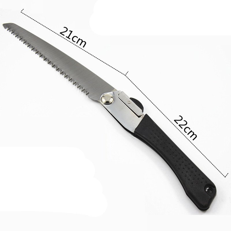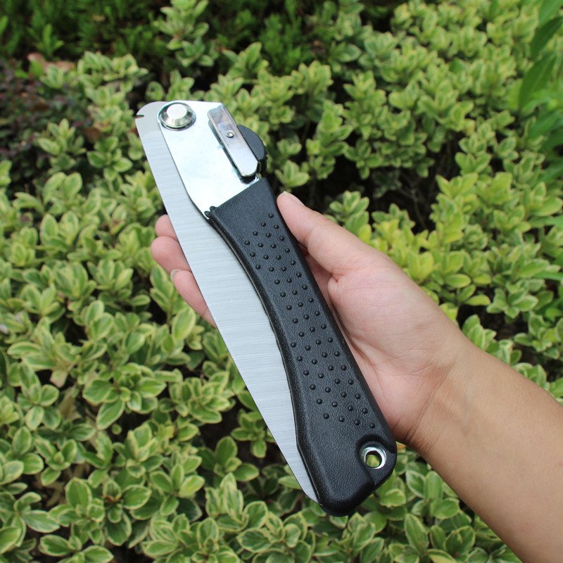 The saw features a rugged high-carbon steel blade with aggressive, sharp teeth designed for quick and clean cutting on green wood, dry wood, bone, and PVC piping. The folding mechanism allows the sharp blade to securely tuck into the handle when not in use, protecting the user and ensuring the teeth remain undamaged during storage. A reliable locking mechanism keeps the blade firmly fixed in both the open and closed positions for enhanced operational safety.
